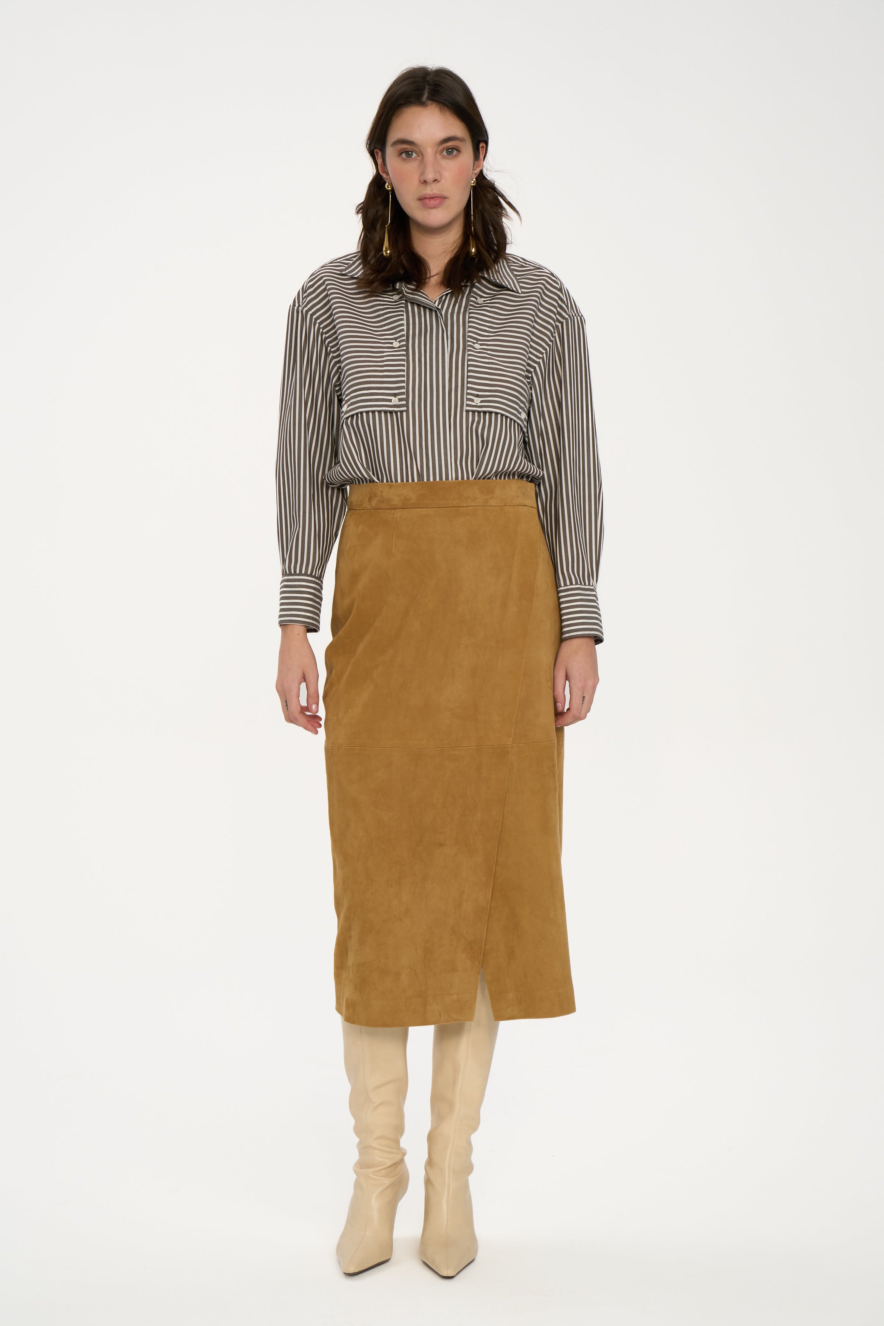 The luxurious tan-brown suede wrap skirt showcases unparalleled craftsmanship, meticulously handmade from the finest Italian leather.