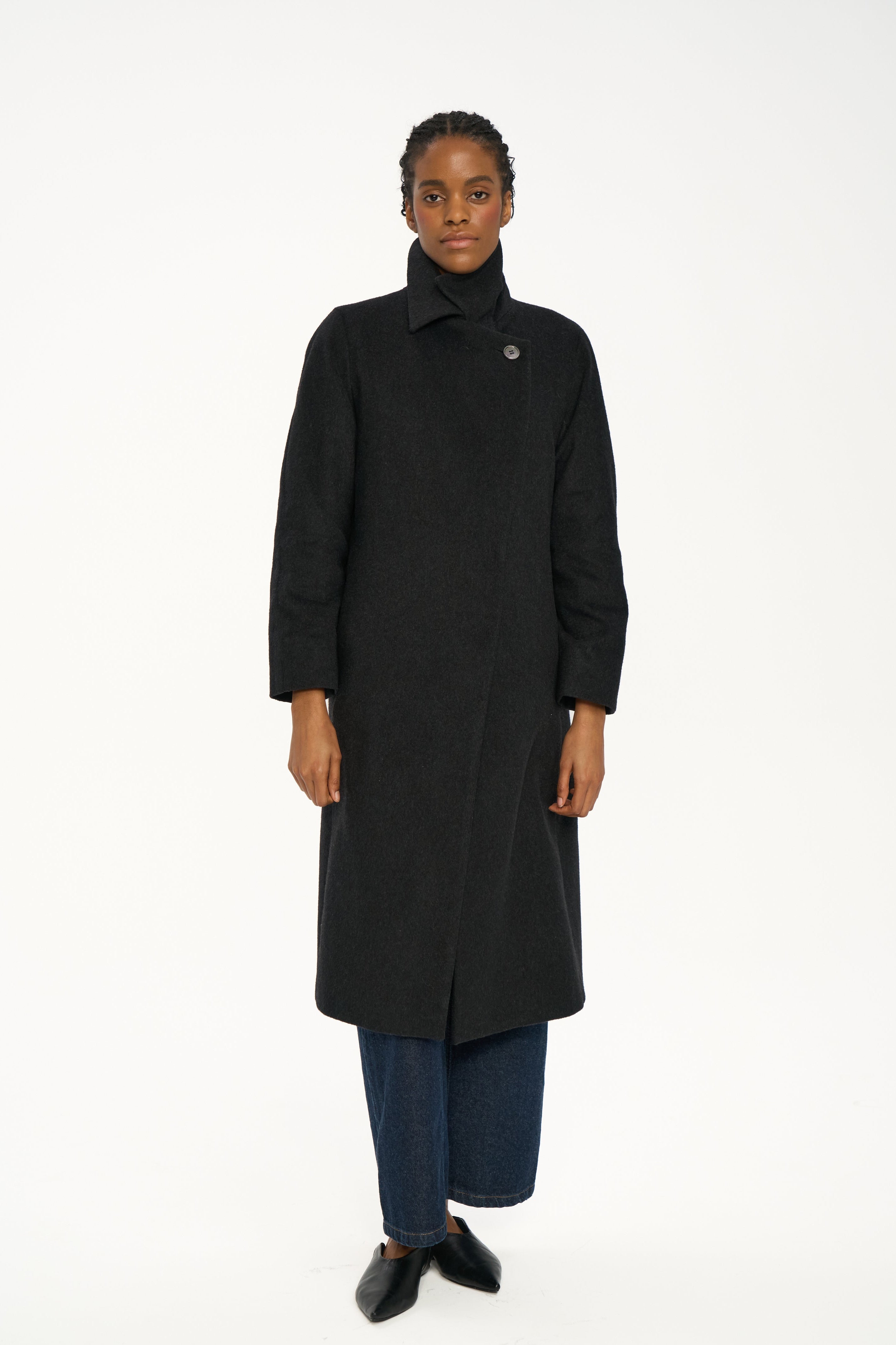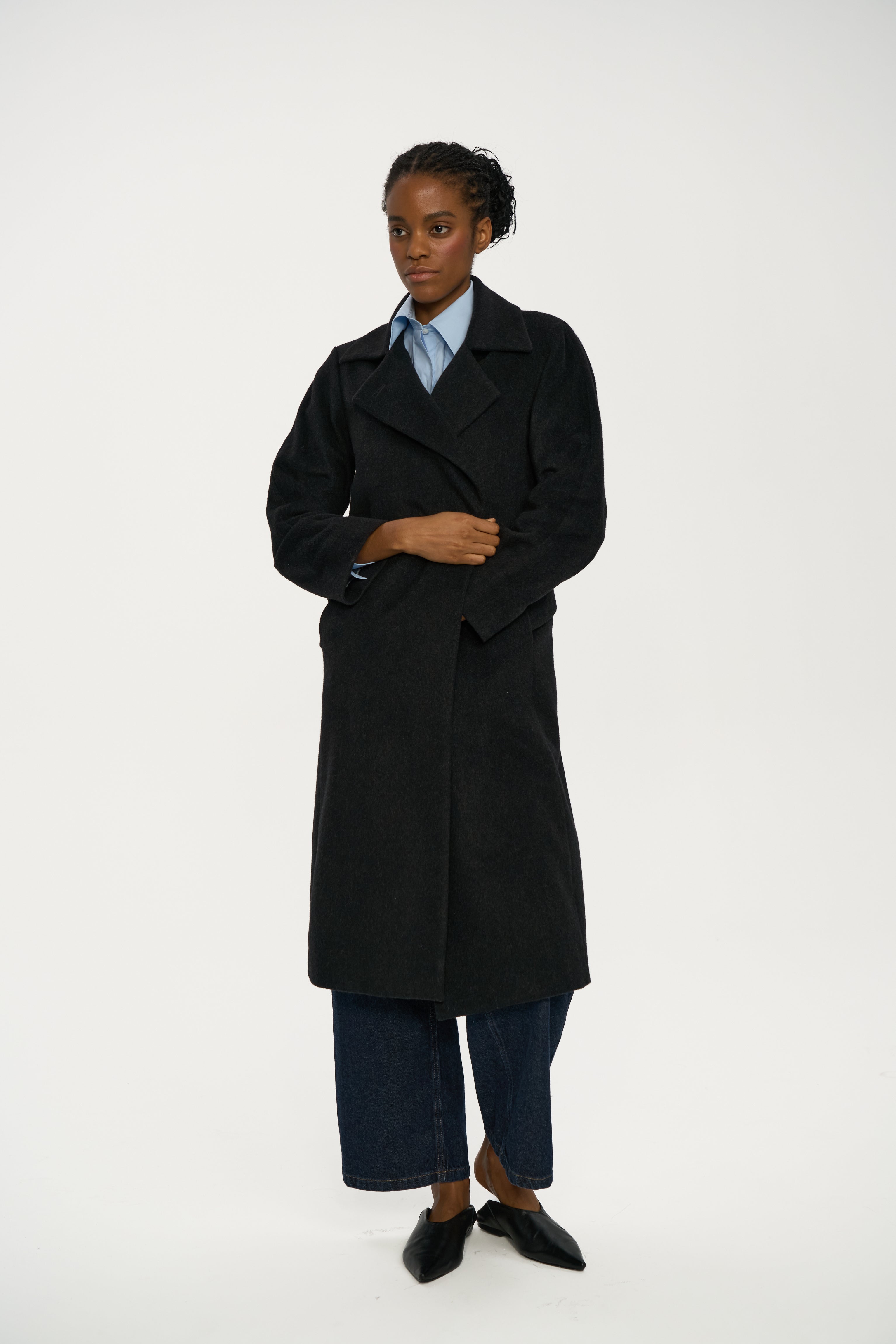 Double-breasted wrap coat in deep charcoal, tailored from 100% pure cashmere with a dense, velvety hand. The silhouette is long and straight, defined by wide lapels, clean shoulders and a generous wrap that closes with a double row of buttons.