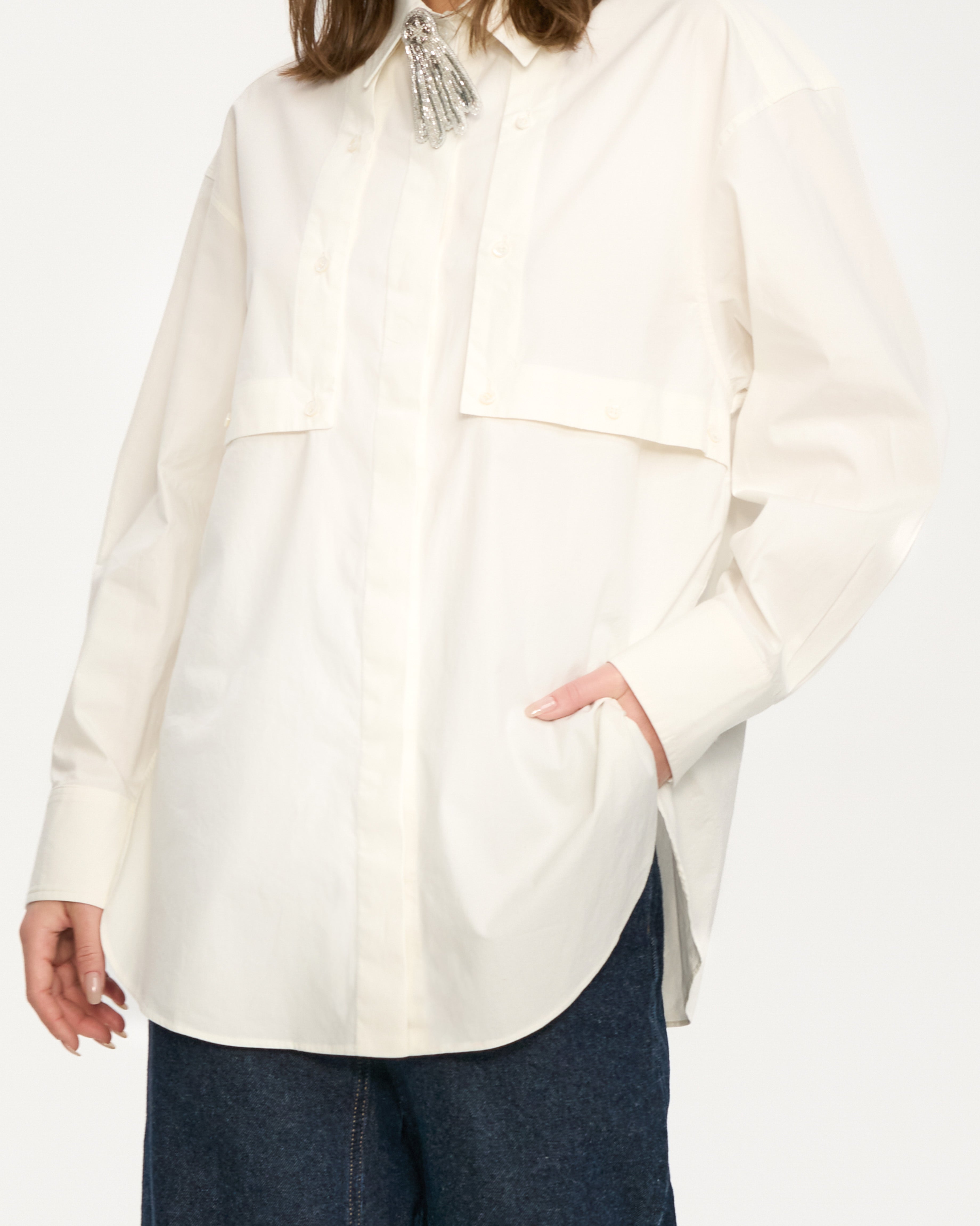 A crisp white shirt cut from soft, breathable cotton poplin with a subtle sheen. The line is straight and slightly relaxed, with a longer length that works over denim, tailored trousers or knit skirts. A sharp collar and slim mother-of-pearl buttons bring a polished, almost jewellery-like finish.