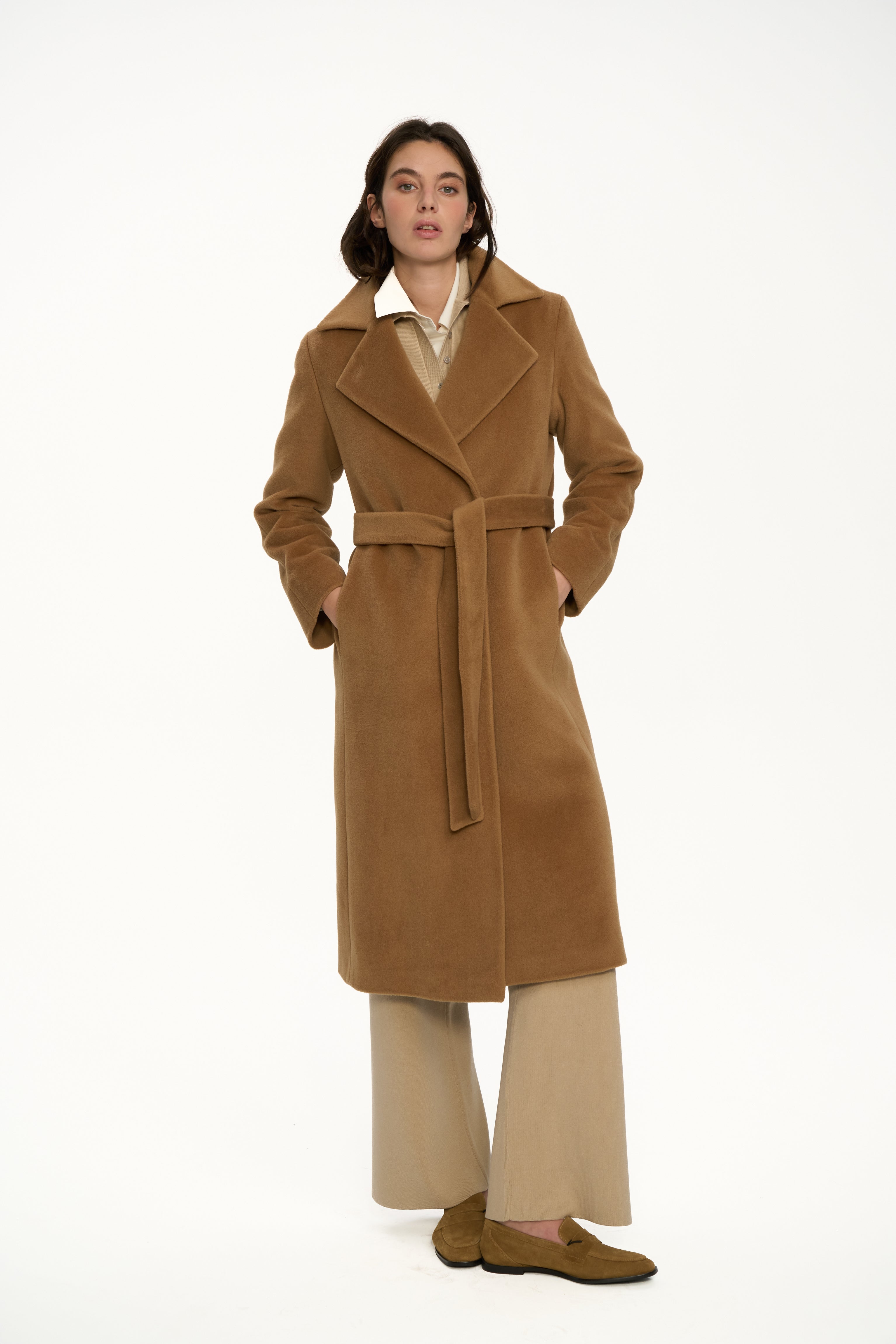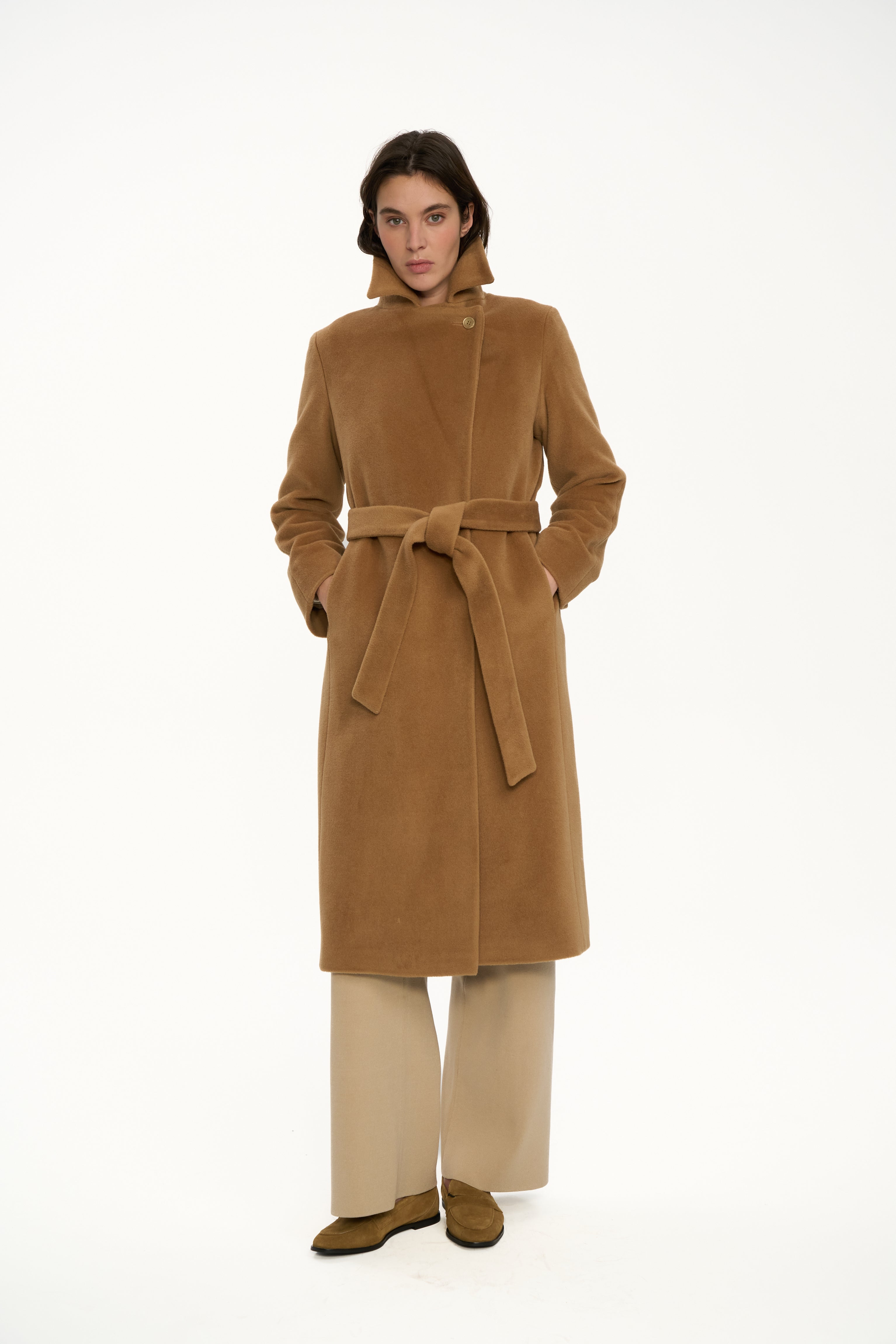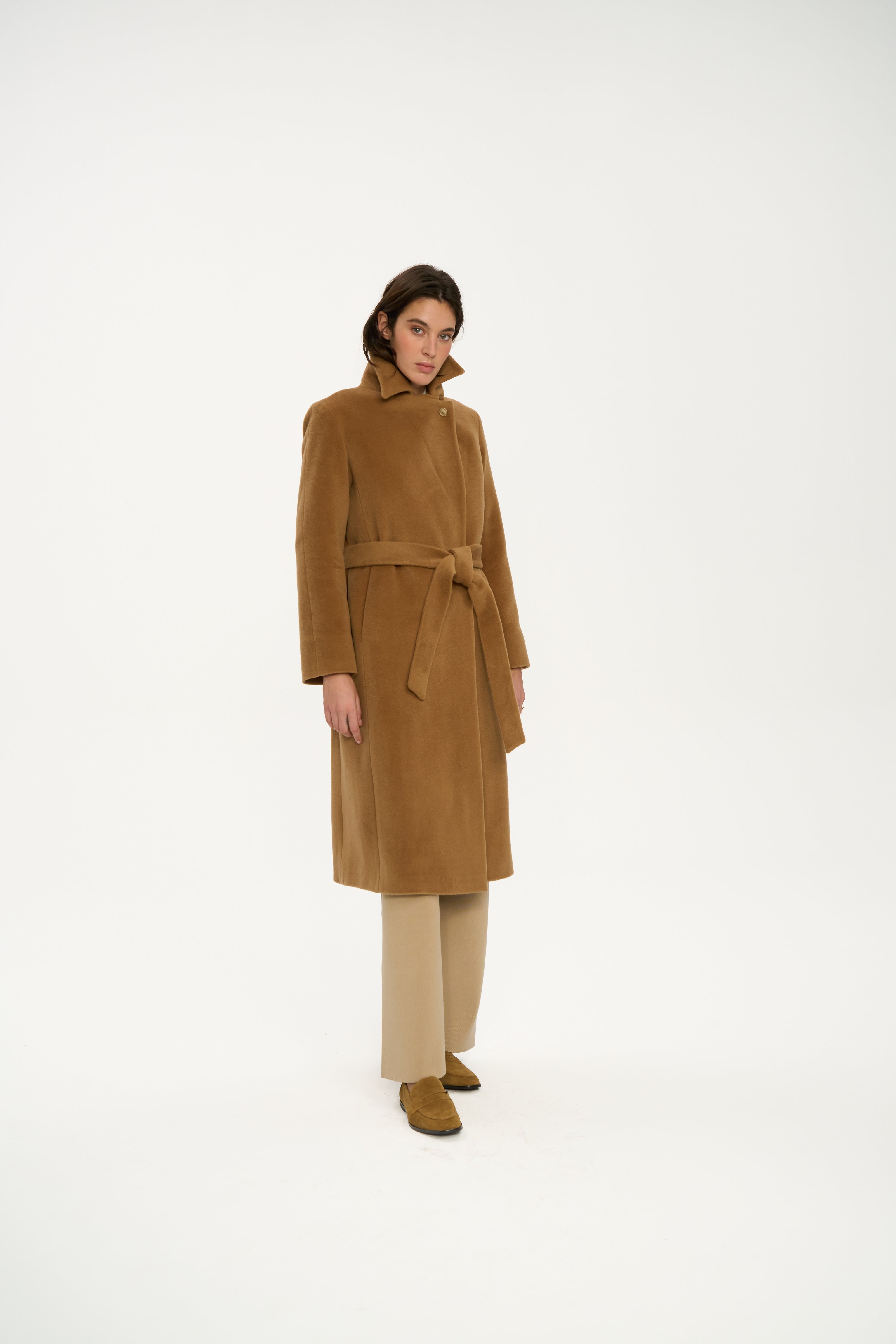 This premium camel wool coat features a clean wrap design, wide sculptural lapels, and a softly structured silhouette, offering both warmth and quiet sophistication.