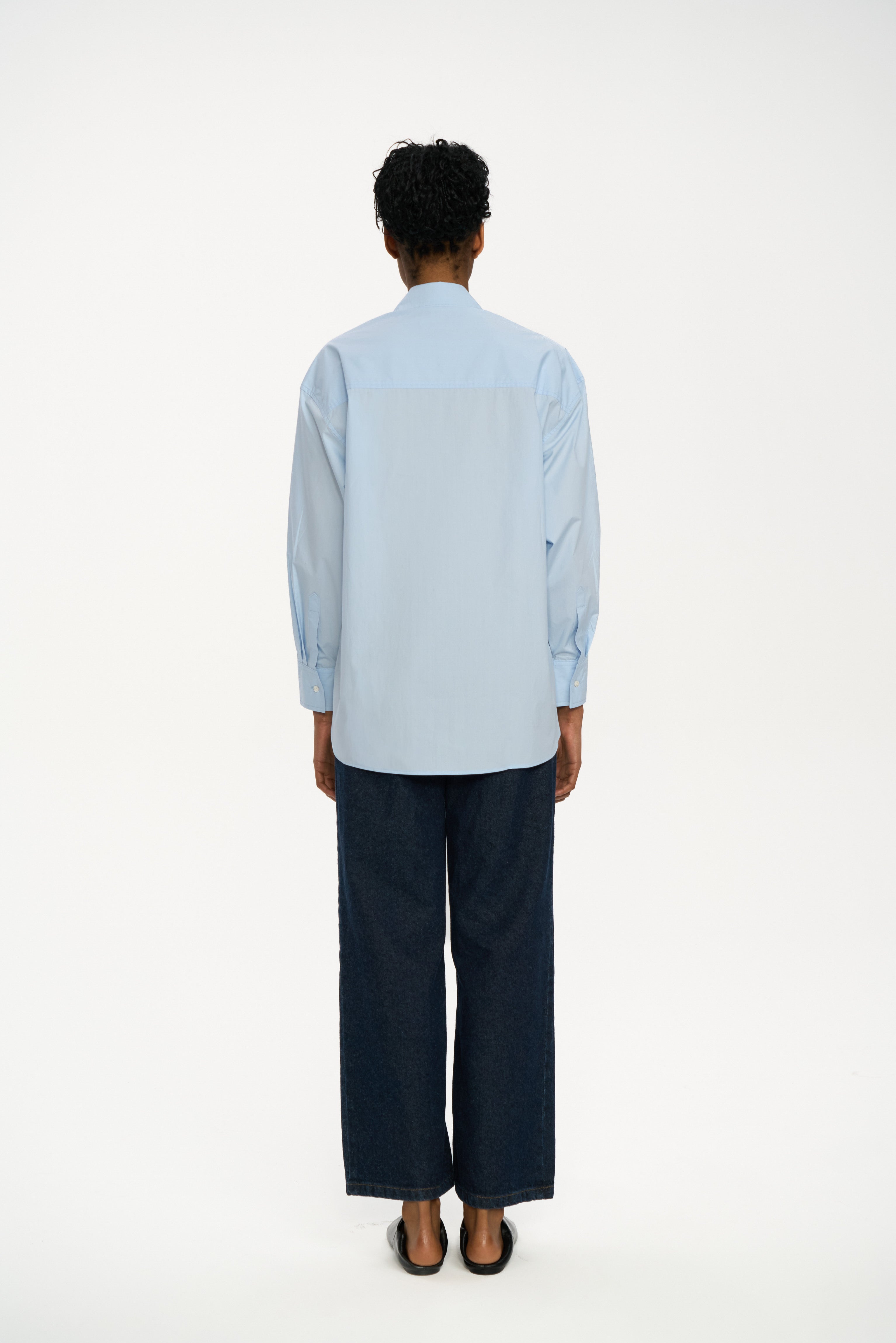 Tailored from soft, breathable poplin, it sits lightly on the body, with a straight line, neat collar and small mother-of-pearl buttons that give a refined finish.