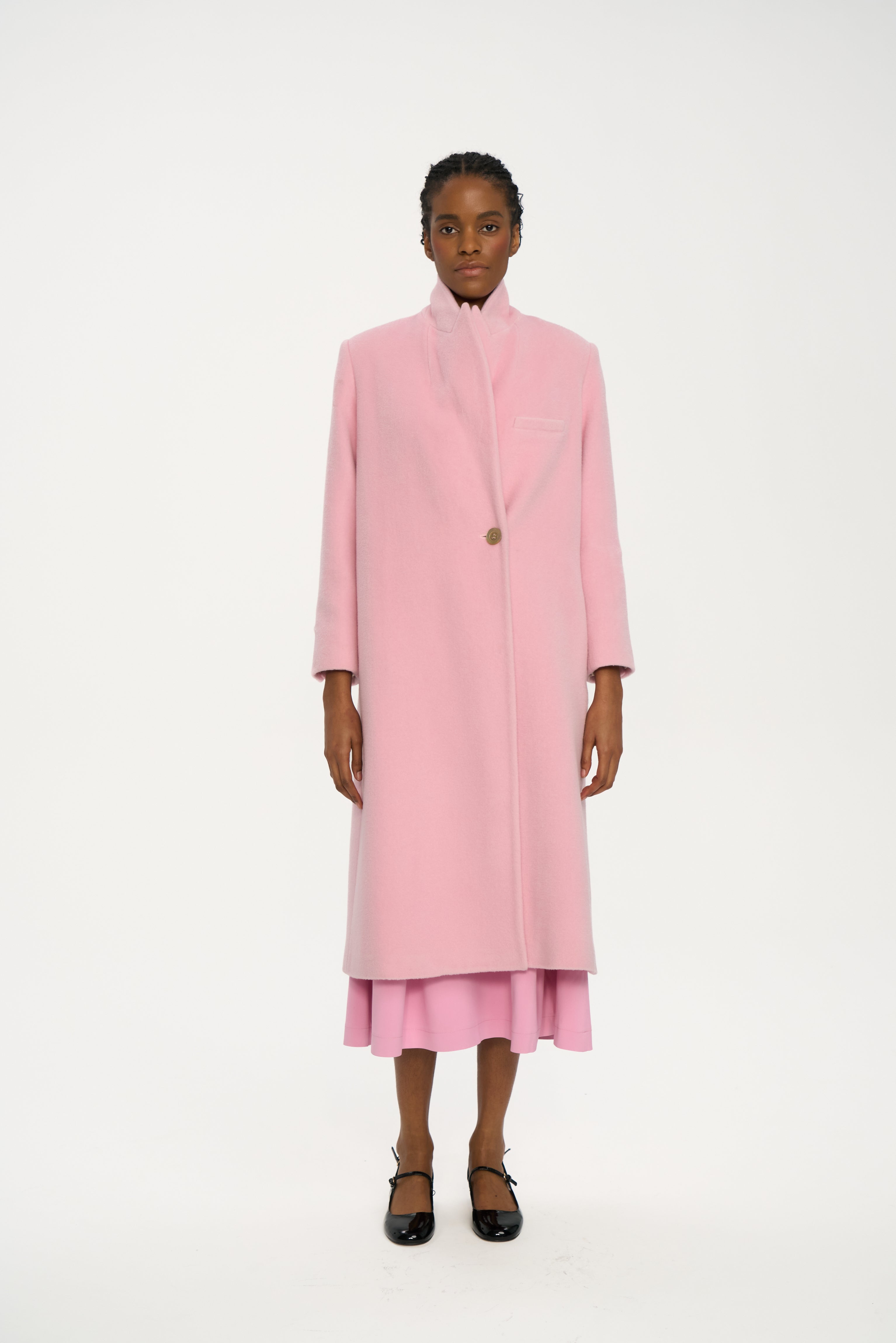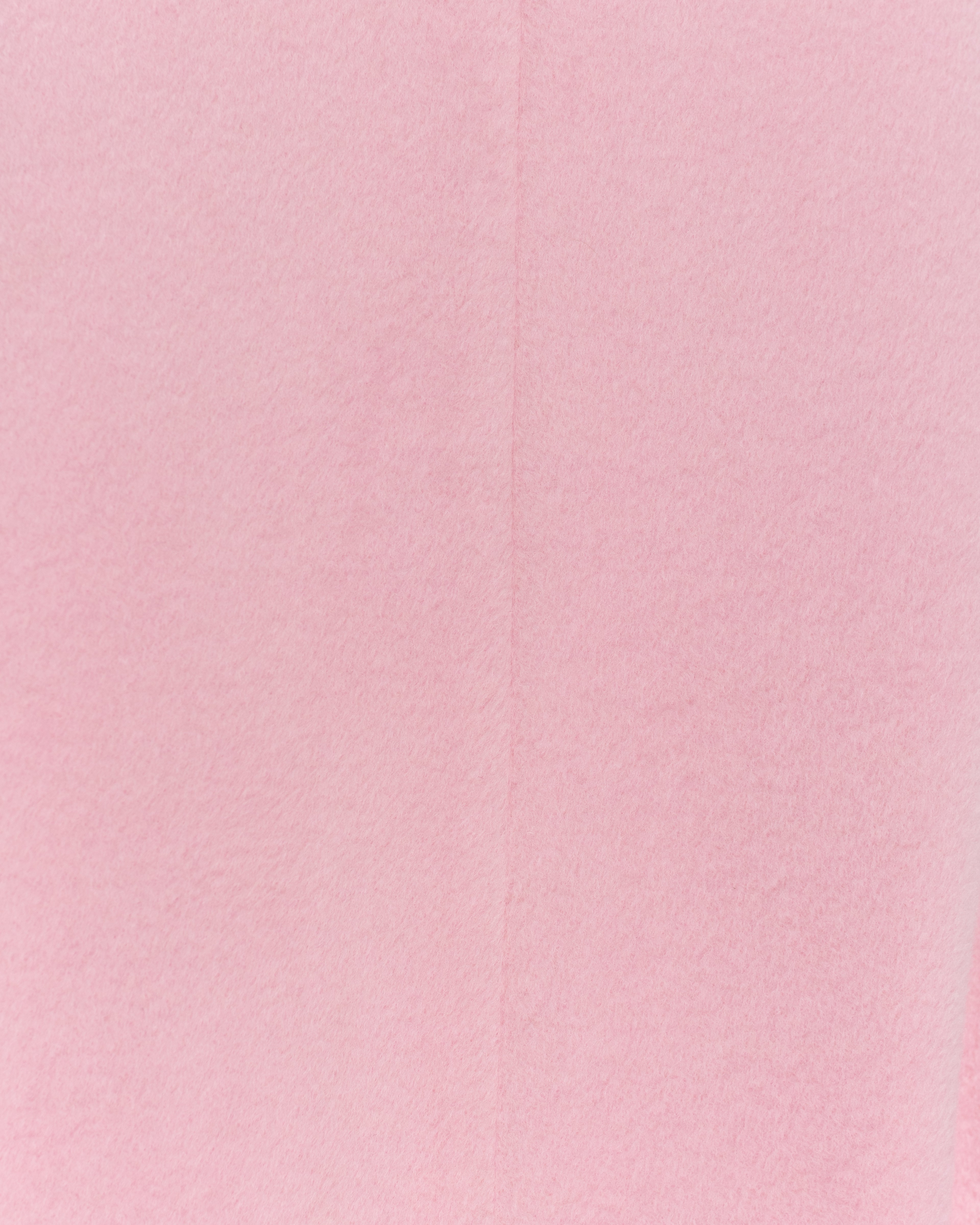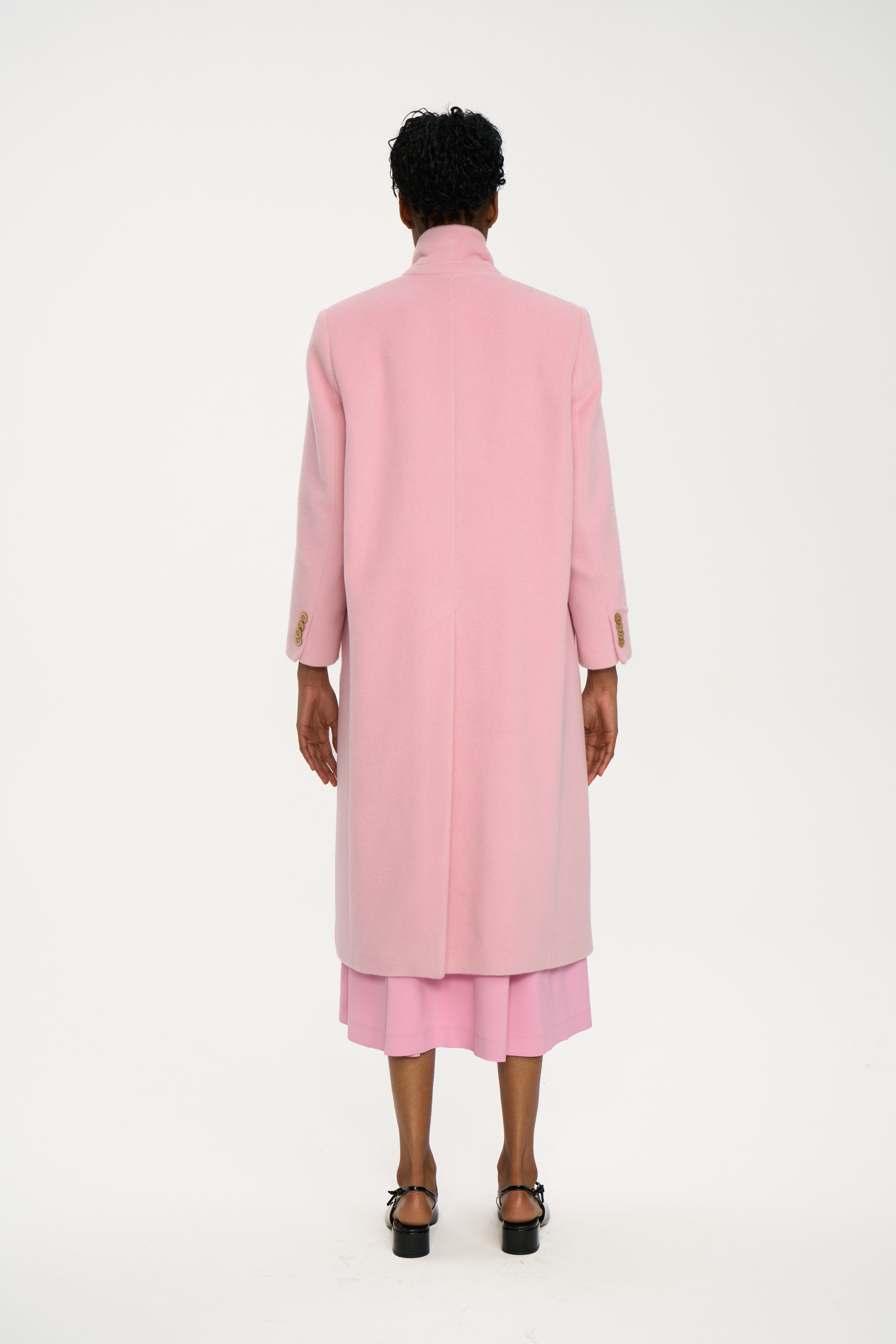 Double-breasted coat in powder pink, tailored from soft pure 100% wool with a smooth, dense hand. The silhouette is straight and elongated, defined by peak lapels, clean shoulders and a precise line that sits neatly over both trousers and dresses. Discreet mother-of-pearl buttons add a subtle, luminous detail to the front.